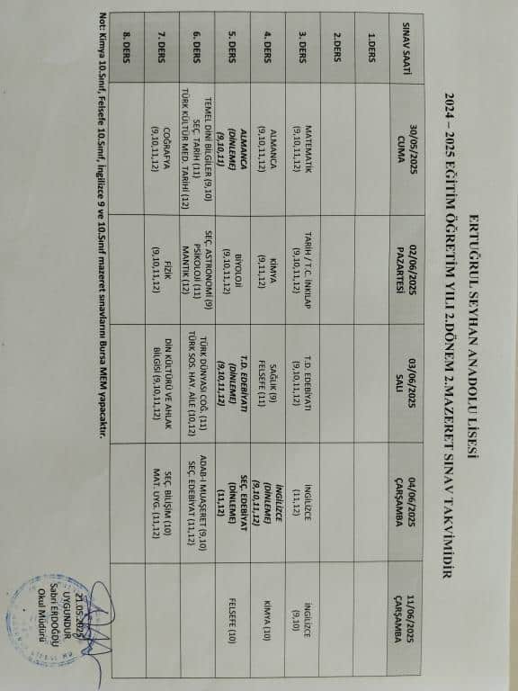 OKULUMUZDA YAPILACAK 2.DÖNEM 2.MAZERET SINAV TAKVİMİNE ALTTA YER ALAN LİNKTEN ULAŞABİLİRSİNİZ.